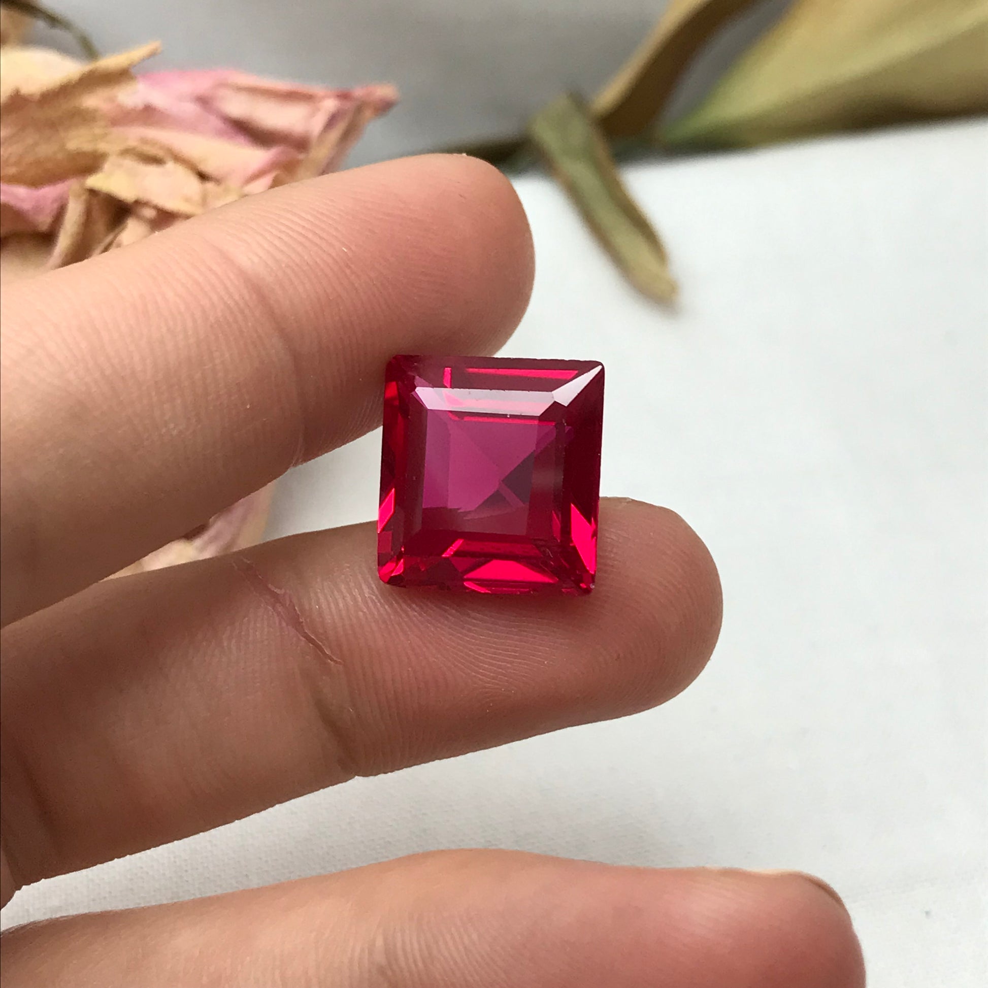 14 Carat Square Cut Lab Created Ruby, 14x13.5mm Loose Faceted Recycled Gemstone
