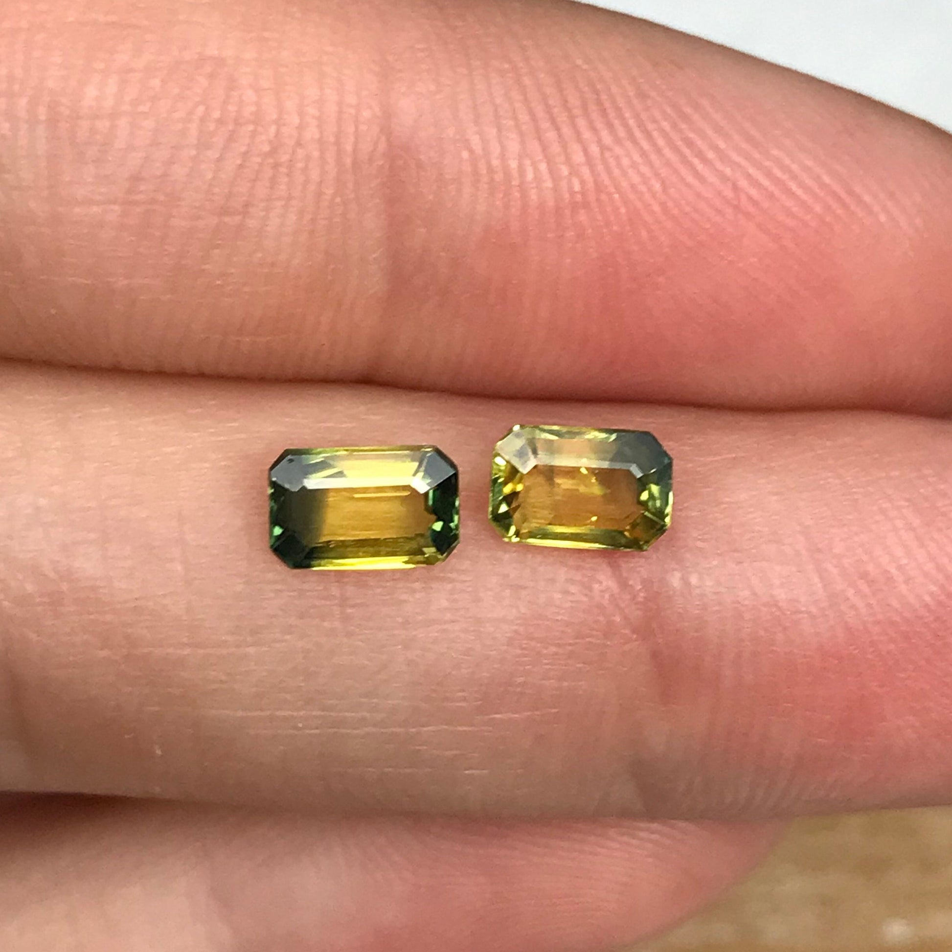 2 Natural Bi-Color Sapphires 6x4mm Yellow Green Sapphires, 0.72 ea. Pair of Emerald cut Sapphires, 1.47 CTW,